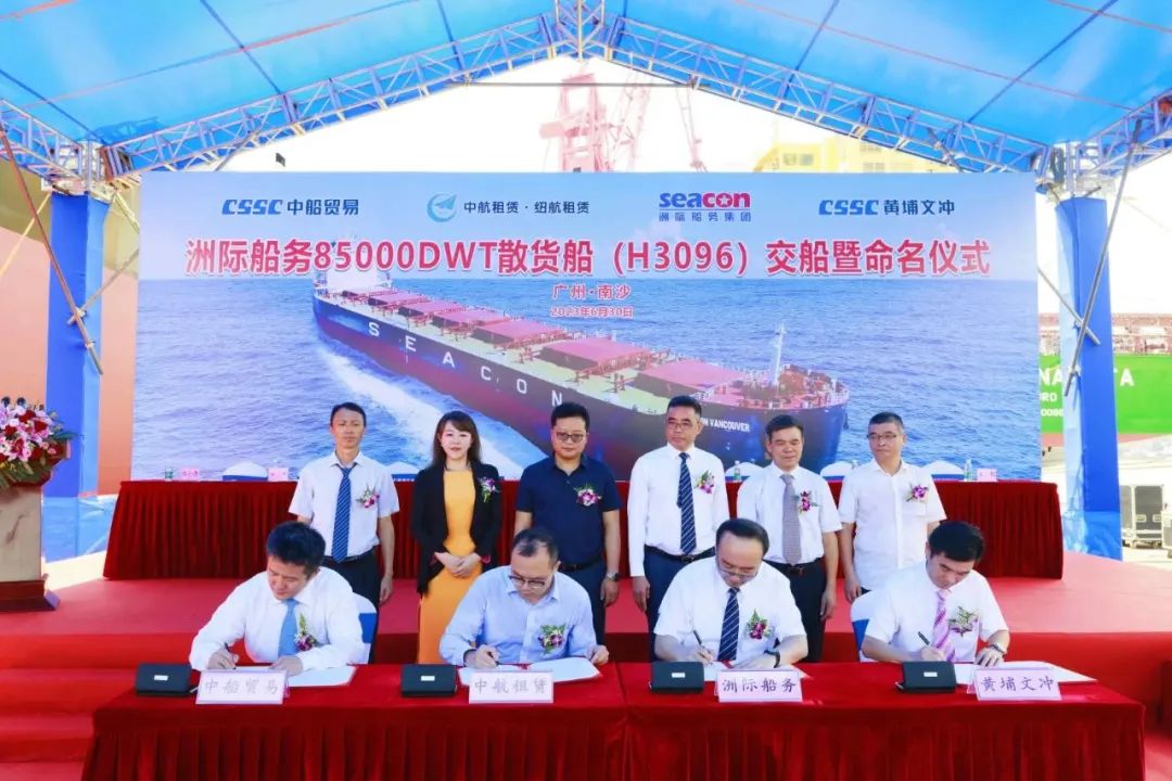 6月30日,中國船舶集團有限公司旗下中船黃埔文沖船舶有限公司聯(lián)合中國船舶工業(yè)貿(mào)易有限公司為洲際船務(wù)集團控股有限公司(洲際船務(wù):02409.HK)建造的85000載重噸(DWT)散貨船在中船黃埔文沖船舶有限公司龍穴廠區(qū)1號碼頭命名交付。