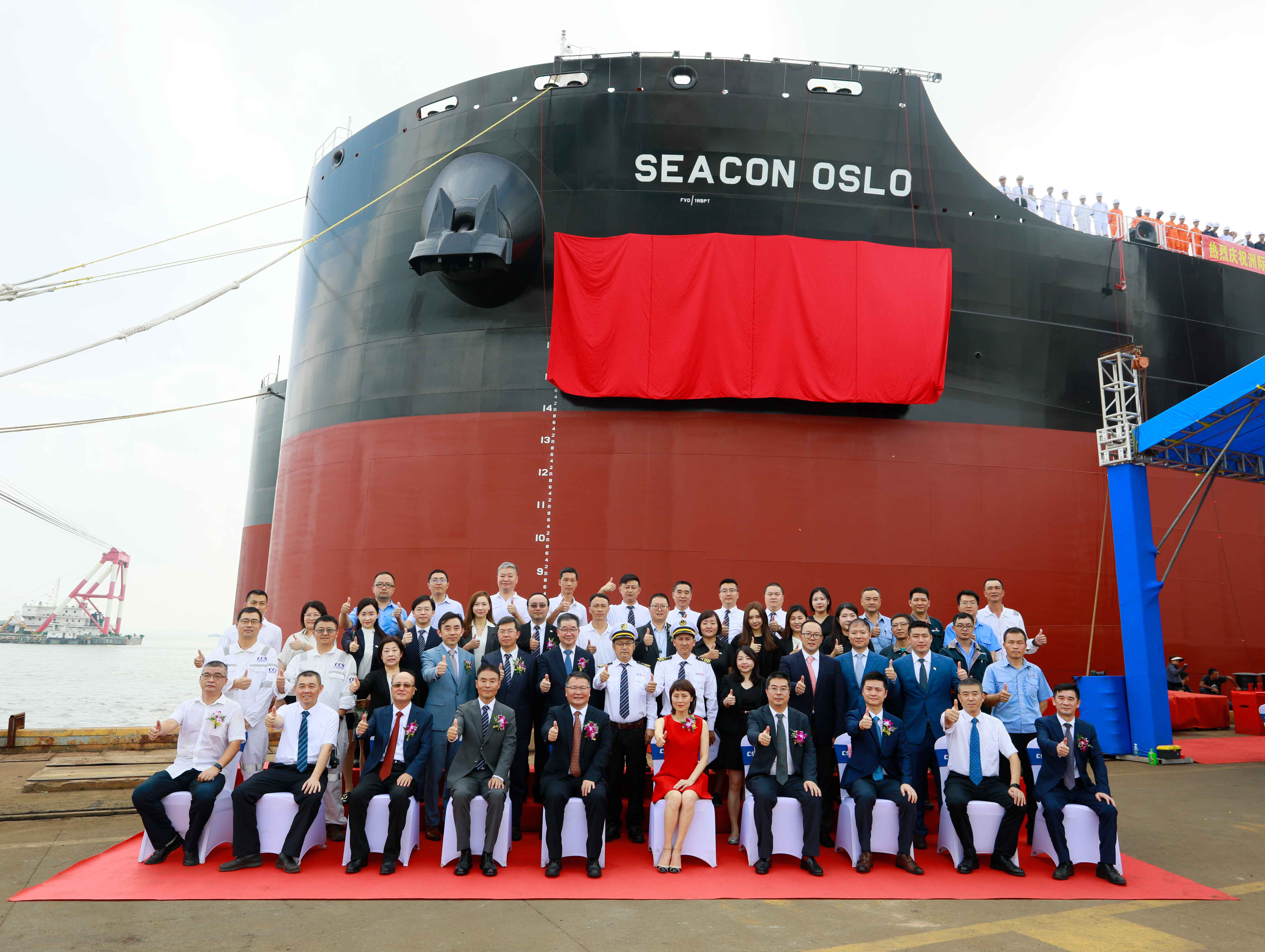 中船黃埔文沖船廠總經(jīng)理羅兵,洲際船務集團控股有限公司獨立董事傅俊元、漢坤律師事務所合伙人繆熙平、交銀金融租賃有限責任公司航運租賃部副總經(jīng)理蔡子楚,以及洲際船務集團控股有限公司董事會主席郭金魁等各方代表參加此次命名交付儀式。洲際船務集團控股有限公司獨立董事、教母張雪梅女士命名該船為“SEACON OSLO”輪。