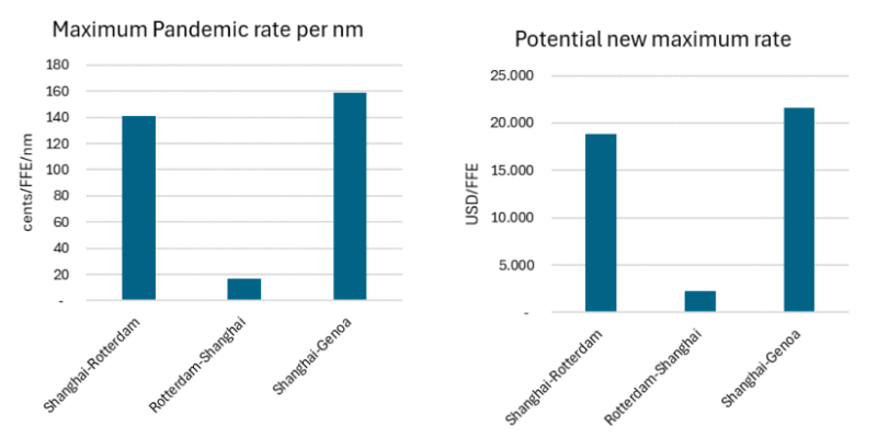 Sea-Intelligence的分析顯示,如果每海里運(yùn)價(jià)達(dá)到疫情期間的水平,從上海到鹿特丹的即期運(yùn)價(jià)將達(dá)到18900美元/FEU,從上海到熱那亞的即期運(yùn)價(jià)將達(dá)到21600美元/FEU,從鹿特丹到上海的回程運(yùn)價(jià)將達(dá)到2200美元/FEU。在疫情期間的絕對(duì)高峰期,亞歐航線的運(yùn)價(jià)在2022年初剛剛突破14000美元/FEU大關(guān)。