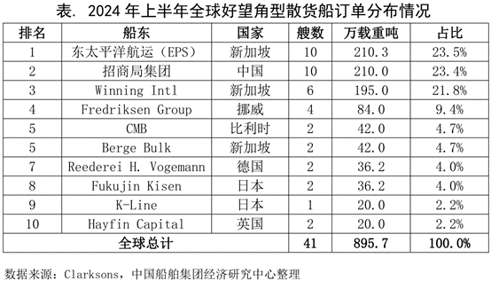 2024年上半年,全球累計(jì)成交散貨船新訂單206艘、1997.6萬(wàn)載重噸,同比下滑22.0%,但好望角型散貨船新訂單卻大幅增長(zhǎng)180%至41艘、895.7萬(wàn)載重噸,達(dá)到2022年和2023年全年成交水平。共有10家船東投放好望角型散貨船新訂單,其中,新加坡船東東太平洋航運(yùn)(EPS)投放最多,為10艘、210.3萬(wàn)載重噸,占比23.5%,招商局集團(tuán)和新加坡船東Winning Intl緊隨其后,占比分別為23.4%和21.8%。