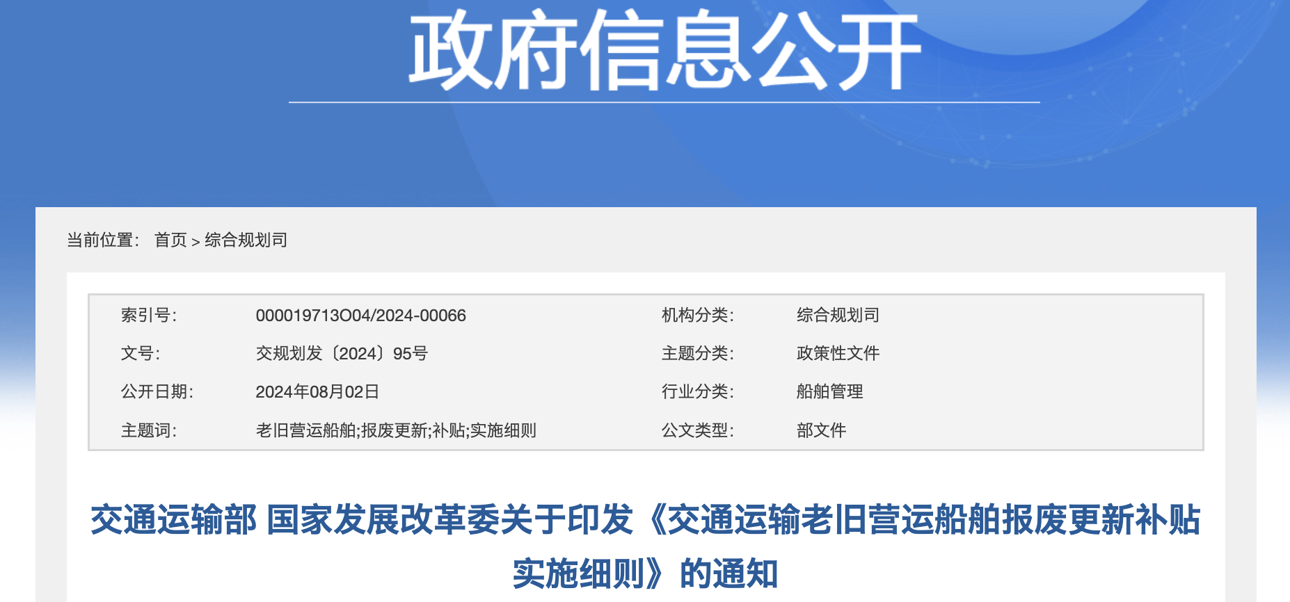 8月2日,交通運(yùn)輸部、國家發(fā)展改革委關(guān)于印發(fā)《交通運(yùn)輸老舊營運(yùn)船舶報(bào)廢更新補(bǔ)貼實(shí)施細(xì)則》的通知,以下為通知全文: