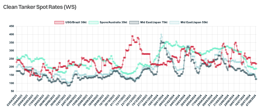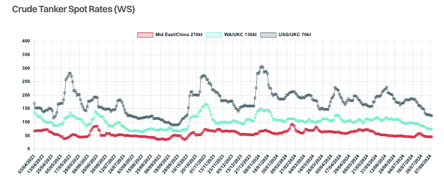 根據(jù)普氏能源資訊數(shù)據(jù),8月8日,從波斯灣向英國(guó)大陸運(yùn)輸 75,000 噸成品油的 LR2 型油輪運(yùn)費(fèi)降至53.47美元/噸,而7月1日這一數(shù)字為74.20美元。原油油輪方面,盡管阿拉伯灣至中國(guó)VLCC運(yùn)費(fèi)在7月24日短暫攀升至13.34美元/噸,但由于季節(jié)性需求疲軟,該運(yùn)費(fèi)從7月1日的10.95美元降至8月8日的10.11美元。