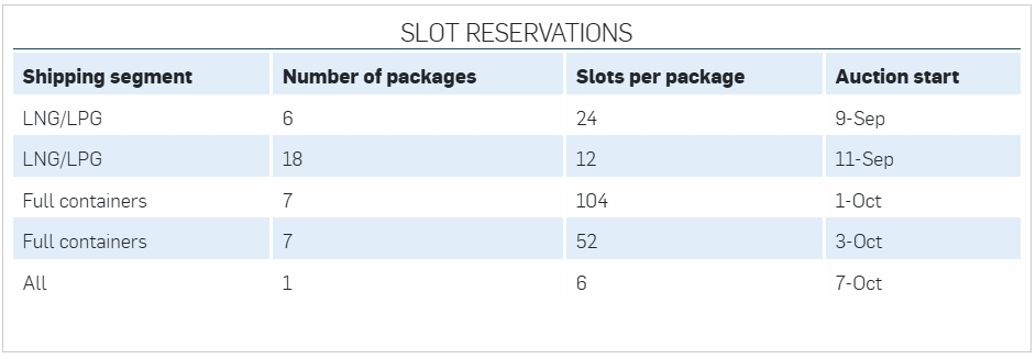 具體的流程安排為:從9月9日開始,液化天然氣(LNG)和液化石油氣(LPG)運(yùn)輸船將對6個時段、每個時段24個過境船位進(jìn)行競標(biāo);9月11日對另外18個時段,每個時段12個過境船位進(jìn)行競標(biāo)。從10月1日起,整箱運(yùn)營商可以對7個時段、每個時段104個船位進(jìn)行競標(biāo),并于10月3日對7個時段、每個時段52個過境船位進(jìn)行競標(biāo)。從10月7日起,任何船型都能夠?qū)蝹€時段的6個過境船位進(jìn)行競標(biāo)。