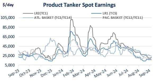 具體而言,MR型油輪市場(chǎng)出現(xiàn)了顯著的波動(dòng)。2024年6月3日,MR型油輪太平洋市場(chǎng)的日均收益為47,277美元,但到了9月4日,收益已經(jīng)大幅跌至16,630美元。在大西洋市場(chǎng),收益也從52,091美元大幅下滑至24,784美元,下降幅度高達(dá)52%。盡管收益因季節(jié)性因素和來自LR2型油輪及原油油輪的競(jìng)爭(zhēng)而有所下降,但冬季即將到來,市場(chǎng)基本面仍然樂觀,短期前景有望回升。