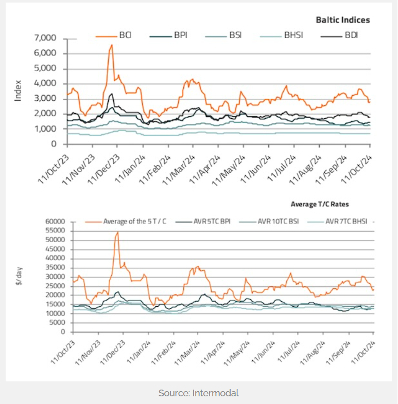 Intermodal指出,巴西玉米出口量正在減少,特別是在第二茬玉米(safrinha)收獲期間。繼去年巴西超越美國成為世界最大玉米出口國之后,巴西的糧食總出口量(包括大豆在內(nèi))同比開始減少。ANEC數(shù)據(jù)顯示,2024年1月至9月,巴西玉米出口量為2349萬噸,而去年同期為3408萬噸。預(yù)計(jì)10月出口量將繼續(xù)下滑至568萬噸,而去年同期達(dá)802萬噸。巴西通常在safrinha收獲期間出口大部分玉米,今年也不例外,但6月至9月期間的出口量比2023年同期減少了25.59%。這一變化不僅影響了巴西的糧食出口總量,也對全球干散貨航運(yùn)市場產(chǎn)生了影響。