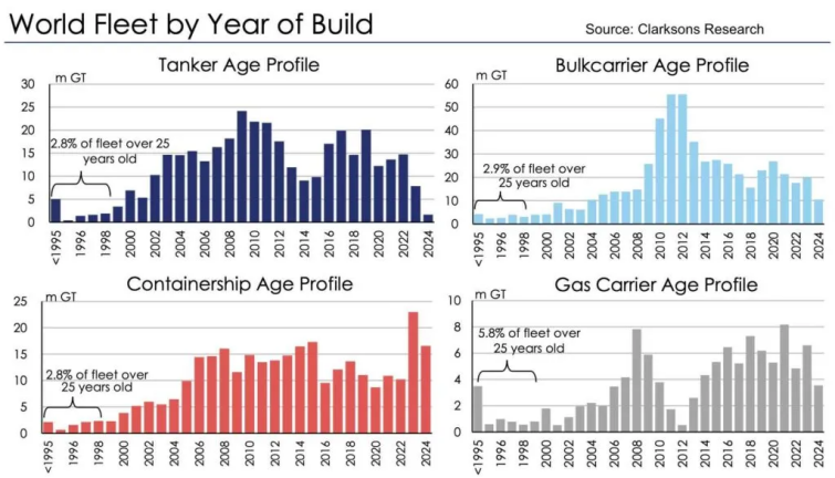 今年之所以會(huì)出現(xiàn)如此大規(guī)模的“訂單潮”,很大原因是如今的全球船隊(duì)已經(jīng)步入“老齡化社會(huì)”。