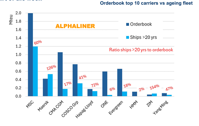 Alphaliner的集裝箱船分析師表示,目前全球十大集裝箱航運(yùn)公司仍在運(yùn)營著683艘船齡達(dá)到或超過20年的船舶,其總運(yùn)力超過260萬標(biāo)準(zhǔn)箱。若以遠(yuǎn)洋貨船的正常商業(yè)壽命為25年為基準(zhǔn),則這些數(shù)據(jù)表明,前十大運(yùn)營商或需動(dòng)用其綜合訂單的44%用于替換最老舊的船舶,而非用于船隊(duì)擴(kuò)張。