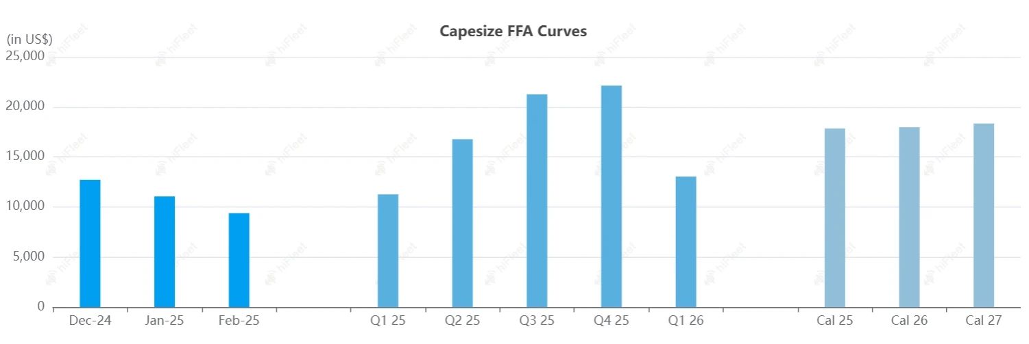 基于波羅的海交易所對(duì)海岬型型船 C5TC平均現(xiàn)貨運(yùn)費(fèi)評(píng)估的1月遠(yuǎn)期運(yùn)費(fèi)協(xié)議(FFA)在周一下跌了4.4%,跌至11,050美元/填。而2月的合約跌幅更大,下降5.3%,降至每日9,375美元。期貨曲線的最低點(diǎn)出現(xiàn)在2月,而市場普遍預(yù)計(jì)3月會(huì)有一定程度的反彈。