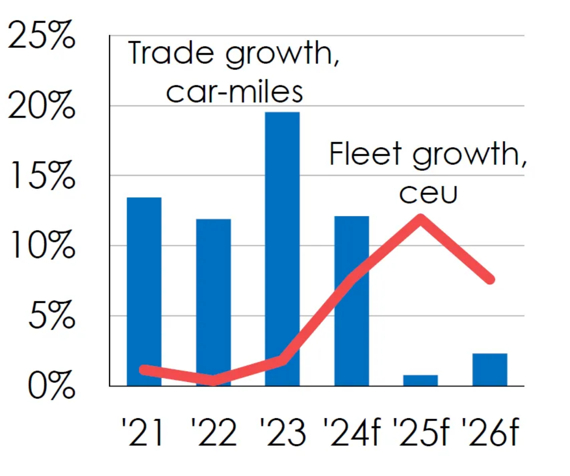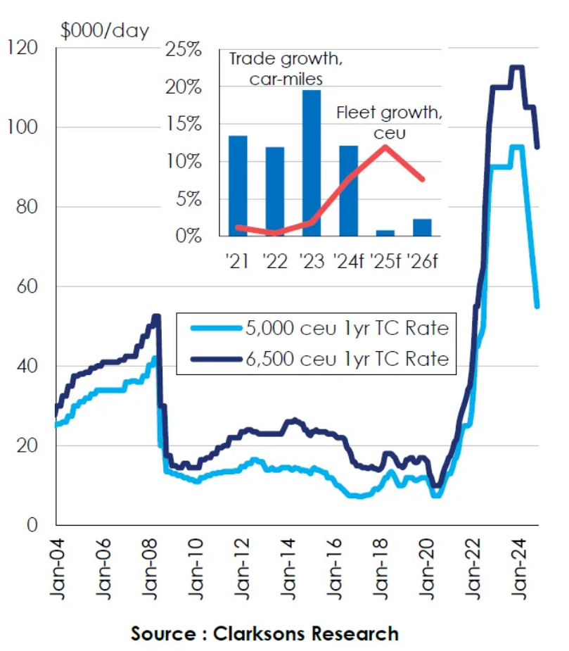 2.中小型船舶面臨競(jìng)爭(zhēng)壓力:較小船型的市場(chǎng)租金顯著下降,例如5,000標(biāo)準(zhǔn)車單位(ceu)船型的一年期租金自2024年初以來(lái)下跌超過(guò)40%。
