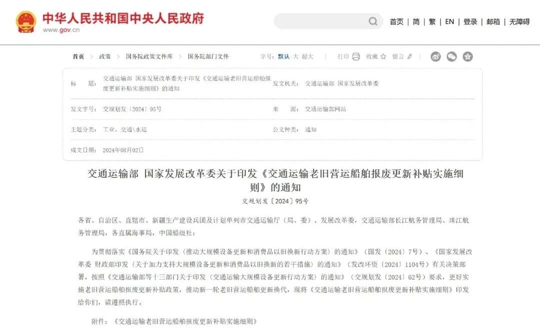 3.發(fā)布《交通運(yùn)輸老舊營(yíng)運(yùn)船舶報(bào)廢更新補(bǔ)貼實(shí)施細(xì)則》8月2日,交通運(yùn)輸部、國(guó)家發(fā)展改革委聯(lián)合印發(fā)《交通運(yùn)輸老舊營(yíng)運(yùn)船舶報(bào)廢更新補(bǔ)貼實(shí)施細(xì)則》(以下簡(jiǎn)稱“《細(xì)則》”),旨在更好實(shí)施施老舊營(yíng)運(yùn)船舶報(bào)廢更新補(bǔ)貼政策,推動(dòng)新一輪老舊營(yíng)運(yùn)船舶更新?lián)Q代?!都?xì)則》對(duì)中華人民共和國(guó)境內(nèi)的中國(guó)籍老舊運(yùn)營(yíng)船舶報(bào)廢更新,按照《細(xì)則》規(guī)定的標(biāo)準(zhǔn)給予資金補(bǔ)貼。具體補(bǔ)貼實(shí)施工作安排以當(dāng)年通知為準(zhǔn)?!都?xì)則》自發(fā)布之日起實(shí)施,于2028年12月31日結(jié)束。