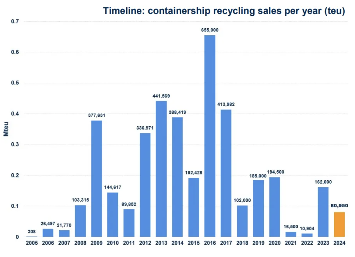 而Alphaliner也預(yù)測,2025年拆船市場有可能大幅增長,由于全球船隊的老化、日益嚴(yán)格的環(huán)境法規(guī),以及高達3百萬TEU的新造船產(chǎn)能將進入市場。