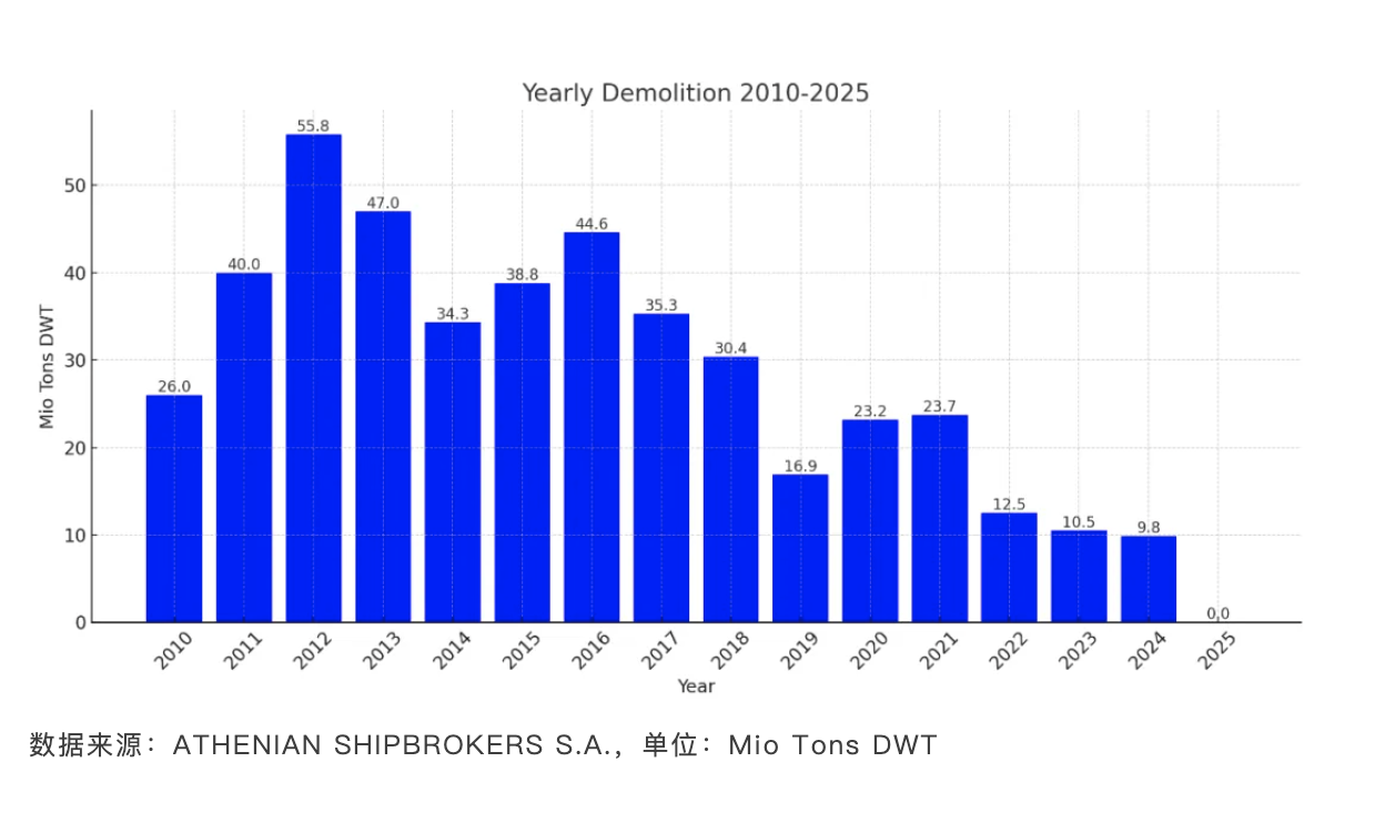 Fearnleys近期指出,“以目前老齡船舶的市場狀況來看,2025年很可能是拆船市場繁忙的一年,因為所有船舶的長期租賃合同都到期了,這批老舊船舶投入運營的難度越來越大。”