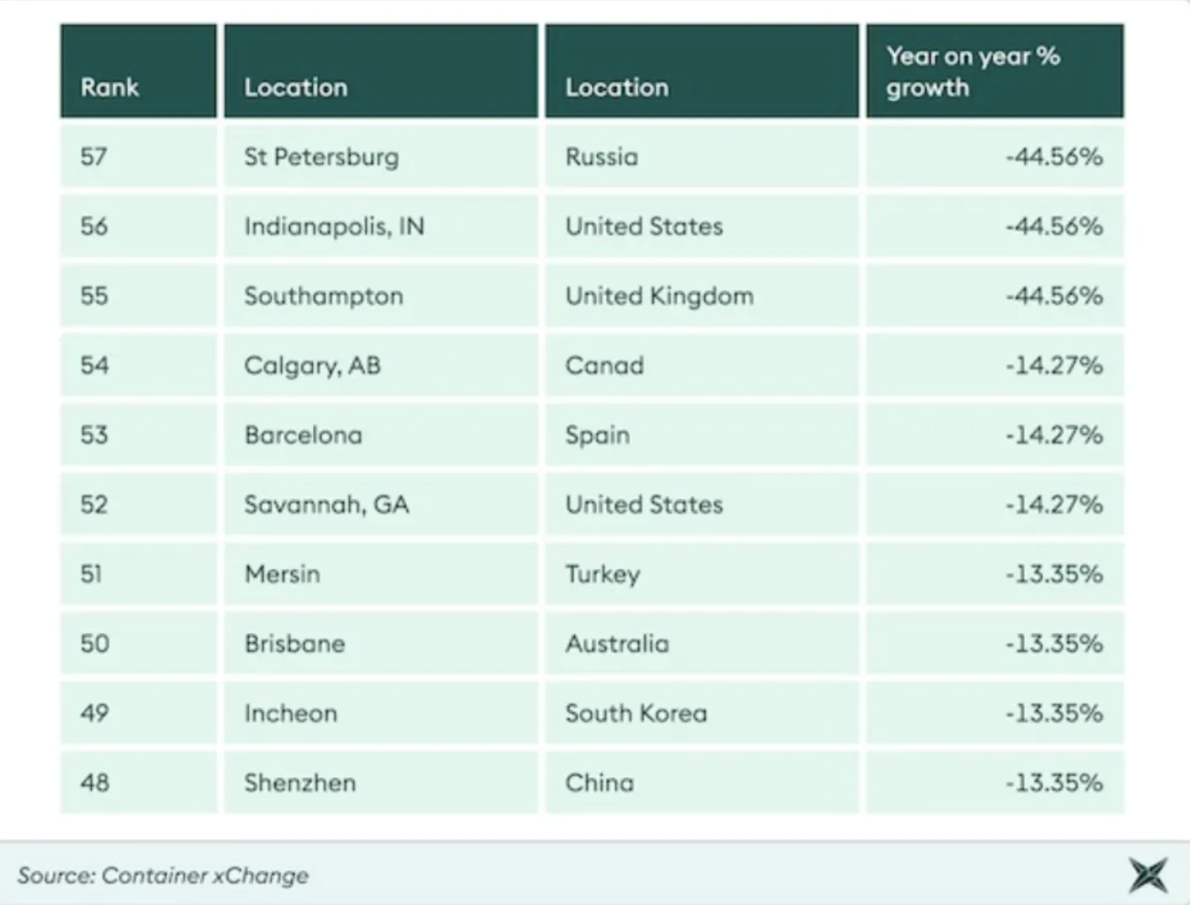 反之,如下地區(qū)的集裝箱價(jià)格跌幅最深,歸因于供過(guò)于求、需求萎縮或其他經(jīng)濟(jì)壓力。