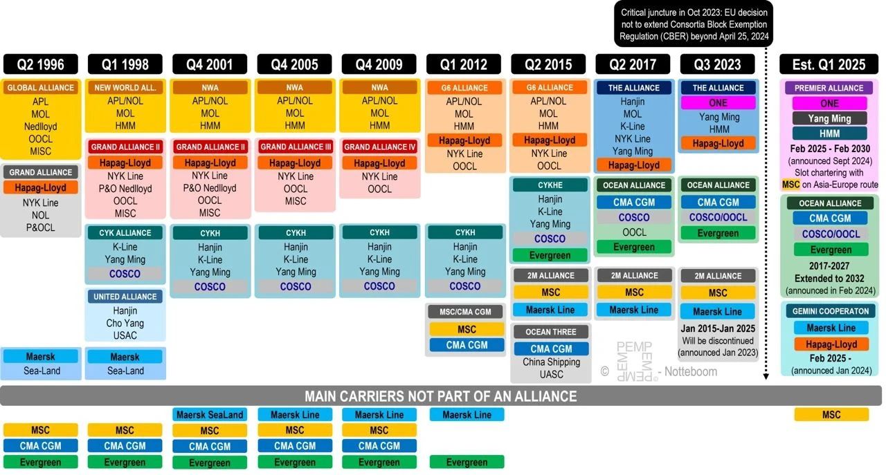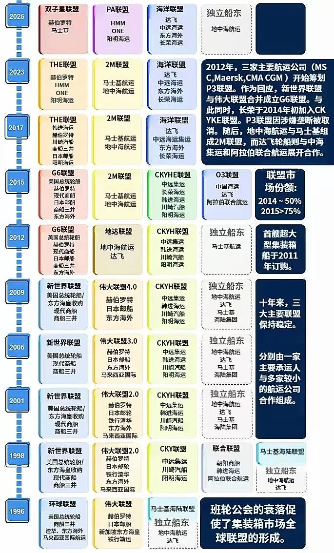 1996年,航運(yùn)公司開始探索新的合作模式以穩(wěn)定市場運(yùn)價和提升競爭力。形成了兩個最初的聯(lián)盟。