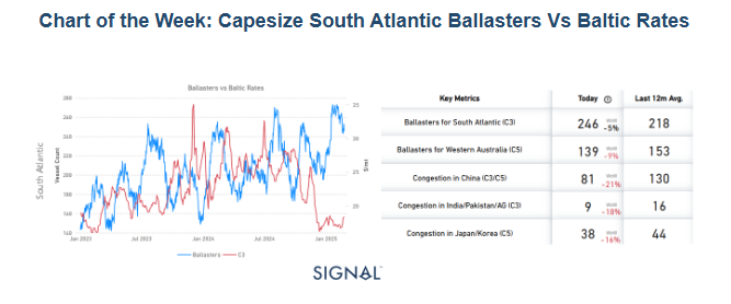 “總體而言,穩(wěn)定的吞吐量、港口庫存的戰(zhàn)略性使用以及壓載船數(shù)量的增加,共同暗示市場正處于一個過渡階段。如果這些趨勢持續(xù),海岬型船日租金可能會繼續(xù)下跌,迫使航運公司重新評估其運力部署和定價策略,以應(yīng)對供應(yīng)逐漸超過新需求的市場環(huán)境。截至月底,南大西洋地區(qū)的壓載船數(shù)量較前期高點小幅下降5%,但仍遠高于年初的歷史低點。目前尚不確定3月的趨勢是否會繼續(xù)下行,這可能為C3航線的運費提供一定支撐。”Signal總結(jié)道。