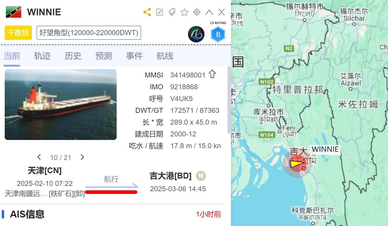 中遠(yuǎn)??破煜麓晫殲楹_\(yùn)圈聚焦提供的AIS數(shù)據(jù)顯示,在2月10日完成最后一個(gè)鐵礦石航次后,“Winnie”輪前往吉大港,目前該船位于孟加拉國的一家拆船廠。