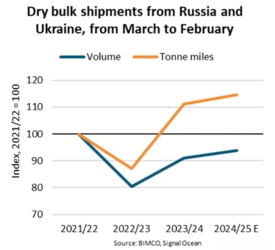 在戰(zhàn)爭的前兩年,俄羅斯干散貨運輸受影響較小,甚至因化肥和糧食出口的增加而有所增長。但過去12個月,俄羅斯煤炭出口下降11%、糧食出口減少2%,導(dǎo)致整體出口量下滑。俄羅斯煤炭占兩國總貨運量的50%。