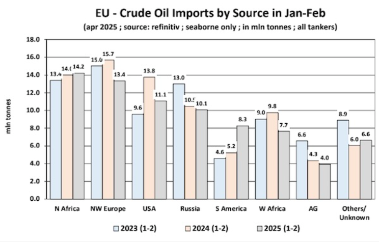 與此同時,“來自俄羅斯港口(包括非俄羅斯來源的油,如哈薩克油)的海運(yùn)進(jìn)口在2025年1月至2月再次下降了-3.8%(同比),降至1010萬噸,并且較2022年1月至2月的2280萬噸下降了超過一半。諾沃羅西斯克仍然是進(jìn)入歐盟的原油最大來源港口,2025年1月至2月占9.5%的進(jìn)口量,達(dá)到950萬噸。俄羅斯港口現(xiàn)已降至歐盟第四大海運(yùn)原油來源,占2025年1月至2月進(jìn)口量的13.4%,位居北非(包括Sidi Kerir港口,18.9%)、北海(17.7%)和美國(14.7%)之后。來自北非(包括Sidi Kerir)的進(jìn)口量同比增加+1.6%,達(dá)到1420萬噸。來自北海(挪威和英國)的進(jìn)口量同比下降-14.9%,降至1340萬噸。來自美國的進(jìn)口量同比下降-19.5%,降至1110萬噸。來自南美到歐洲的運(yùn)輸量同比增長+57.9%,達(dá)到830萬噸。來自土耳其(Ceyhan港口)的運(yùn)輸量同比增長+9.6%,達(dá)到310萬噸,高于2024年1月至2月的280萬噸,”船舶經(jīng)紀(jì)公司總結(jié)道。
