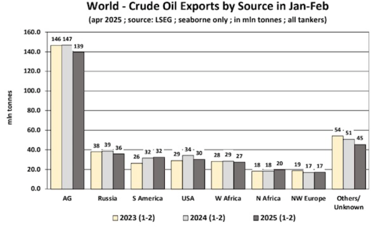 Banchero Costa表示:“來自阿拉伯海灣的原油出口在2025年1月至2月下降了-5.0%(同比),降至1.395億噸,占全球海運(yùn)原油貿(mào)易的40.1%。來自俄羅斯港口的出口(包括哈薩克油)也下降了-7.1%(同比),降至3590萬噸,占全球貿(mào)易的10.3%。來自南美的出口增加了+2.6%(同比),達(dá)到3230萬噸,占全球市場的9.3%。來自美國的出口在2025年1月至2月下降了-11.3%(同比),降至3040萬噸,占8.7%的市場份額。來自東南亞的出口在2025年1月至2月大幅下滑了-33.2%(同比),降至1540萬噸(但這不可避免地反映了俄羅斯原油的再出口變化)。"