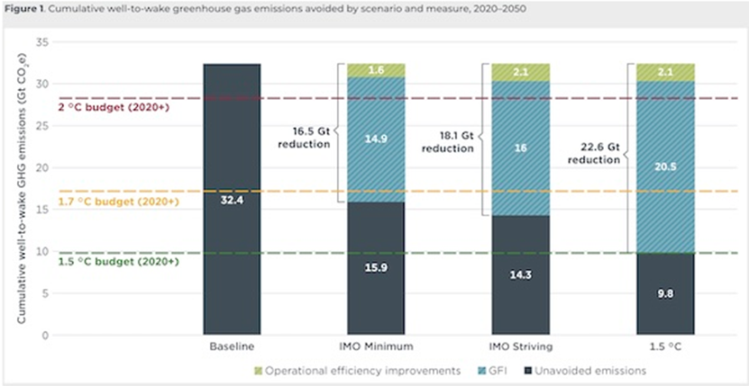 研究分析了國(guó)際航運(yùn)2020年至2050年的累計(jì)排放量,并與全球碳預(yù)算的分配比例進(jìn)行了比較。減排可以通過(guò)單獨(dú)降低全球平均GFI或結(jié)合船舶運(yùn)營(yíng)效率提升來(lái)實(shí)現(xiàn)。