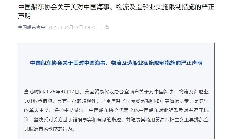 當(dāng)?shù)貢r(shí)間2025年4月17日,美國(guó)貿(mào)易代表辦公室頒布關(guān)于對(duì)中國(guó)海事、物流及造船業(yè)301調(diào)查措施,具有顯著的歧視性,嚴(yán)重違背了國(guó)際貿(mào)易規(guī)則和中美海運(yùn)協(xié)定,是典型的單邊主義、保護(hù)主義做法。中國(guó)船東協(xié)會(huì)代表全體中國(guó)船東對(duì)此強(qiáng)烈反對(duì)并嚴(yán)正抗議,堅(jiān)決反對(duì)美方基于錯(cuò)誤事實(shí)和偏見的指控,并譴責(zé)其濫用貿(mào)易保護(hù)主義工具擾亂全球航運(yùn)市場(chǎng)秩序的行為。