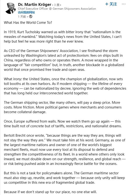 Kroger在社媒上發(fā)文,措辭激烈地指出:“作為德國(guó)船東協(xié)會(huì)的負(fù)責(zé)人,我親眼目睹了華盛頓這場(chǎng)新一輪貿(mào)易保護(hù)主義風(fēng)暴所帶來的沖擊。所謂的‘公平競(jìng)爭(zhēng)’,實(shí)則是在全球自由貿(mào)易體系中再豎一道屏障。”