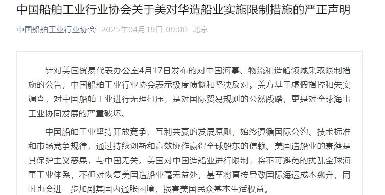 針對(duì)美國(guó)貿(mào)易代表辦公室4月17日發(fā)布的對(duì)中國(guó)海事、物流和造船領(lǐng)域采取限制措施的公告,中國(guó)船舶工業(yè)行業(yè)協(xié)會(huì)表示極度憤慨和堅(jiān)決反對(duì)。美方基于虛假指控和失實(shí)調(diào)查,對(duì)中國(guó)船舶工業(yè)進(jìn)行無理打壓,是對(duì)國(guó)際貿(mào)易規(guī)則的公然踐踏,更是對(duì)全球海事工業(yè)協(xié)同發(fā)展的嚴(yán)重破壞。