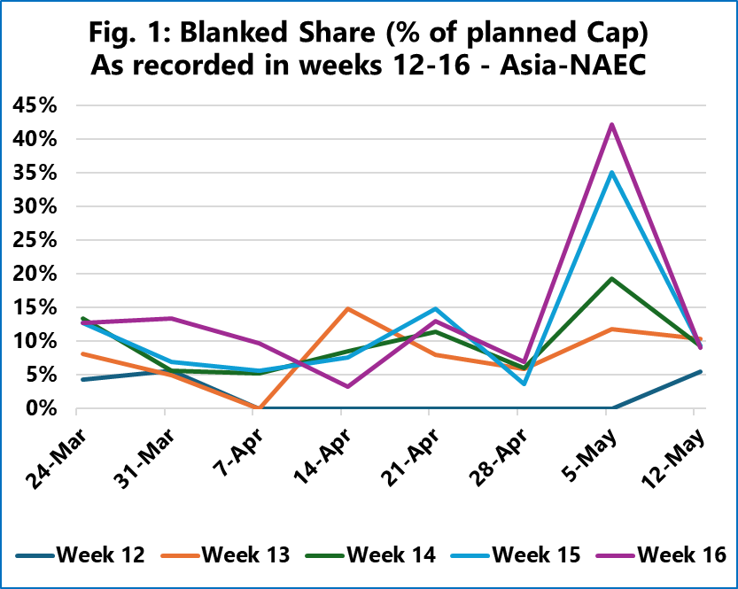 在亞洲至北美西岸航線的表現更為提前,原定4月28日出發(fā)的航班中,有28%的艙位在第16周時已被宣布取消,相比一周前的13%幾乎翻倍。這一變化的節(jié)奏和幅度,均可與中國農歷新年或國慶黃金周后的季節(jié)性調整相媲美。