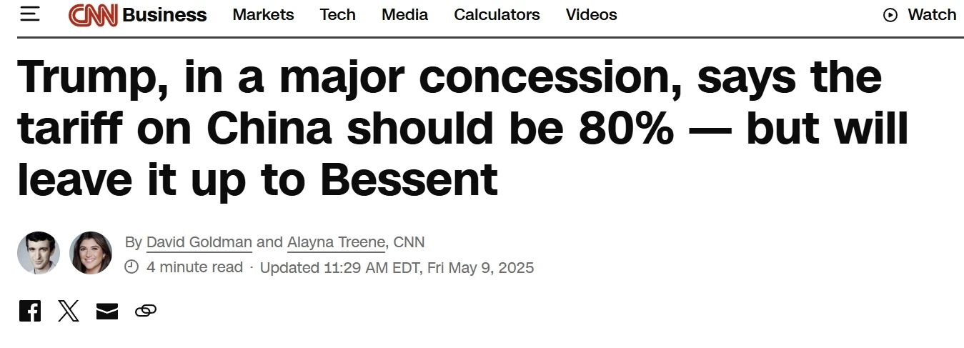 當(dāng)?shù)貢r(shí)間周五,特朗普在社交媒體發(fā)文稱:“對(duì)中國(guó)征收80%的關(guān)稅看起來(lái)合理!交給財(cái)政部長(zhǎng)Scott Bessent決定。”