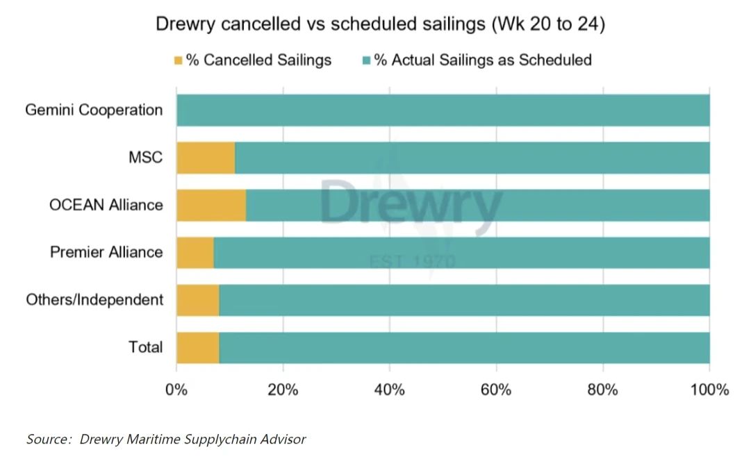 根據(jù)德路里最新數(shù)據(jù),從2025年5月12日到2025年6月15日,主要的東西向主航線——跨太平洋、跨大西洋以及亞洲-北歐和地中海航線——已經(jīng)宣布了58個(gè)航次取消,取消航次總數(shù)占計(jì)劃692個(gè)航次的8%,其中,約62%將在跨太平洋東向航線。