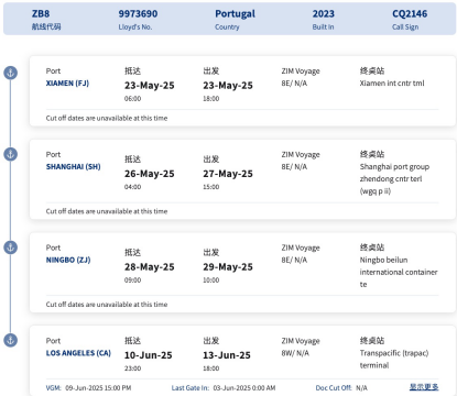 ZX2美西快線往返航程35天,港序:上海-寧波-洛杉磯-上海,在4月22日5500箱“Mississippi”輪駛離洛杉磯港后暫停。